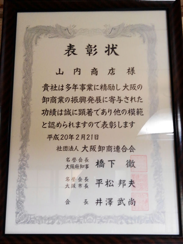 2008年 大阪卸商連合会より橋下府知事・平松市長連名の表彰状をいただきました。