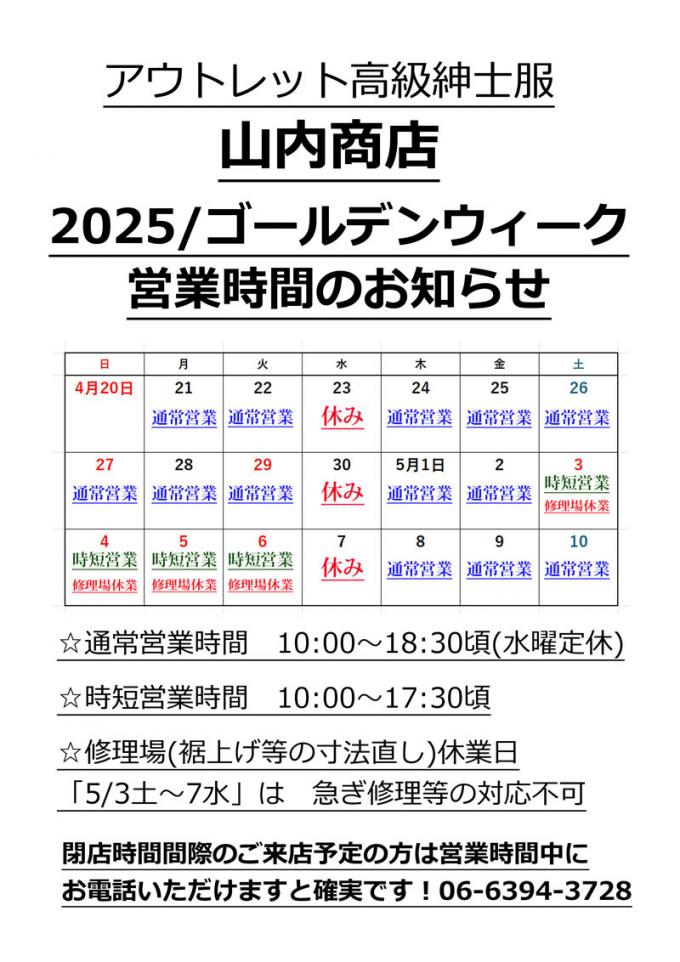 また、5/3土~7水まで修理場が休業となりますので、この間裾上げなどの寸法直しに対応ができませんので、お急ぎの方はご注意願います。