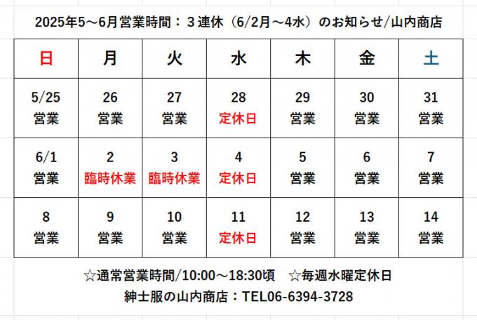 カレンダーの通り、6/2月・3火は臨時休業となります。6/4水の定休日と合わせて「3連休」となりますのでお間違えの無いようご注意願います。