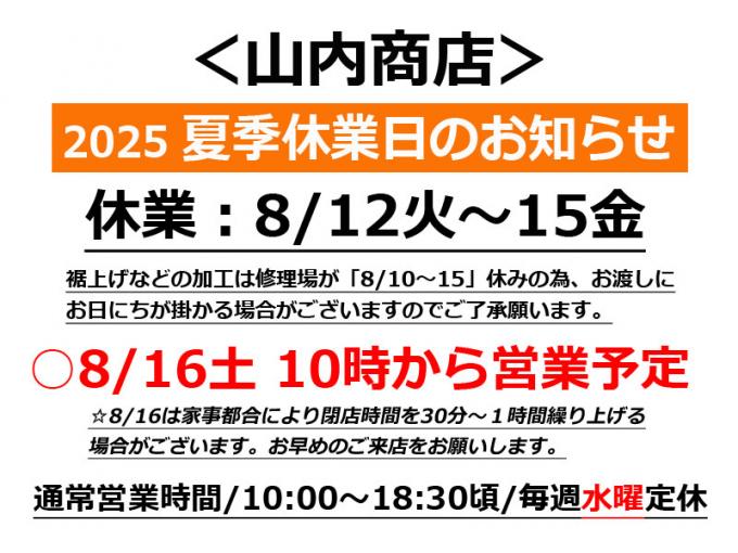 お知らせ:山内商店の年末年始休業は<12/30水~1/3日>予定ですが、営業時間など変更の場合もありますので、確定次第こちらのページに表記させていただきますのでご確認いただけますようお願いいたします。山内商店