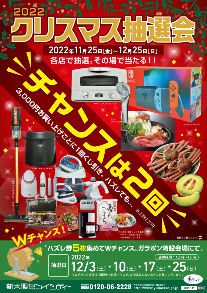 各店舗で3,000円(税込)お買い上げごとに、1回くじが引いてその場で当たる抽選会を実施します。 ハズレても再チャレンジ! ハズレ券5枚を集めて、ガラポン特設会場にてもう1回Wチャンス!!! ※ガラポン特設会場は12月3日(土)、10日(土)、17日(土)、25日(日)の4日間のみ開催。各日受付時間:10~17時。お間違えのないようお願い致します。